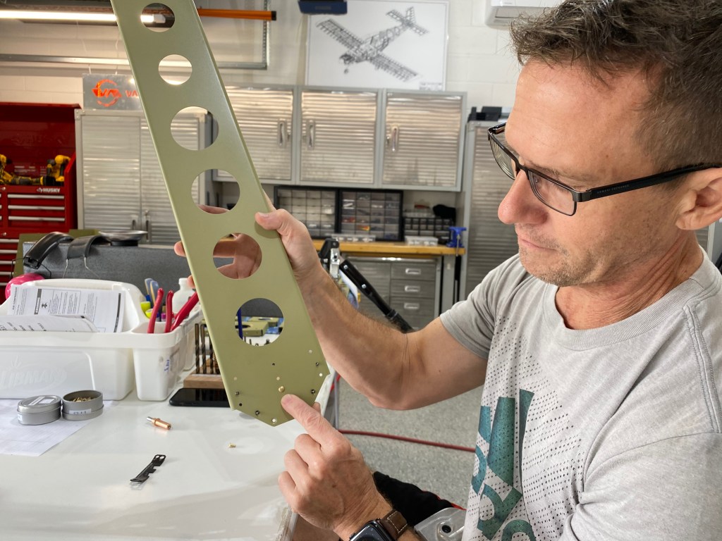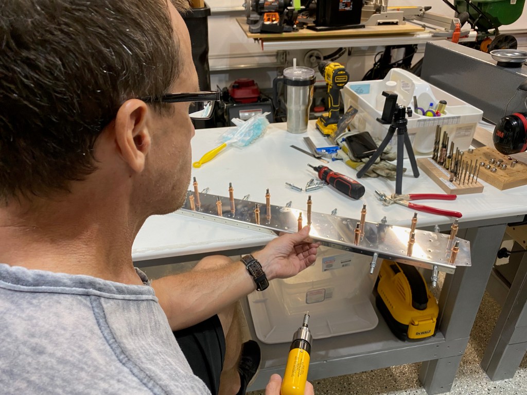 With priming finished we set about assembling all this green aluminum. Starting with the rear spar, I squeeze the first rivet…with thousands more to go!