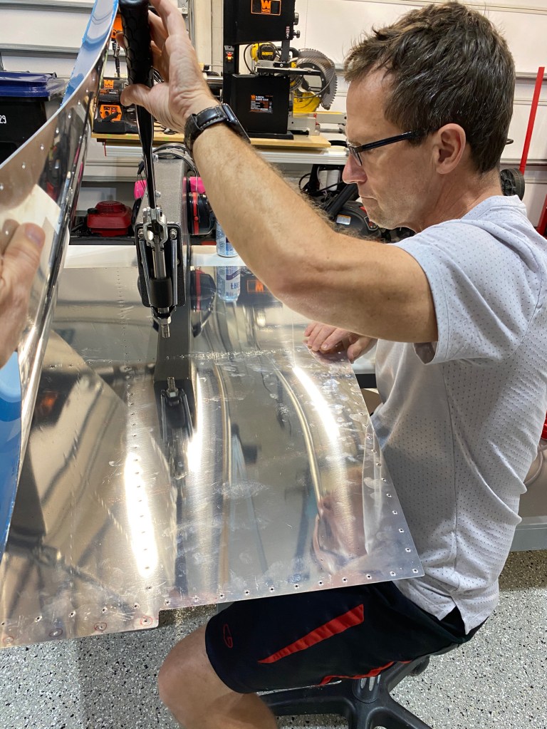Sometime it works out that you can buck the rivets yourself. I’ve covered some of the tungsten bucking bar with painters tape to keep it from scratching the skin while the bar bounces around during riveting.
