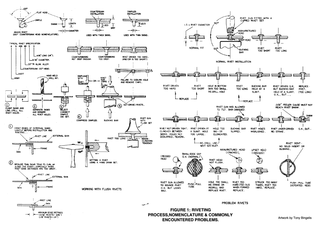 Now we cleco the skin to the substructure and begin bucking rivets. Bucking rivets takes more skill than squeezing rivets. You need to keep the rivet gun from sliding off the rivet or you’ll damage the skin. You, or someone else, needs to keep the bucking bar held on the shop side of the rivet as flat as possible. Van’s includes this handy ‘little’ (ahem) cheatsheet to help determine a good rivet from one that is not so good.