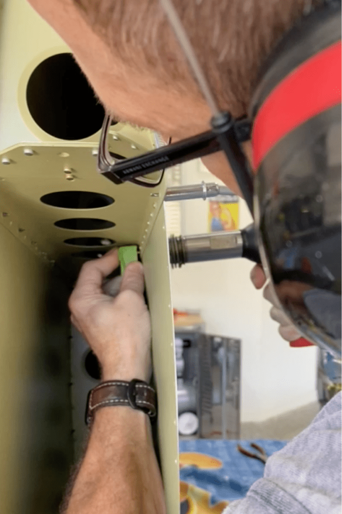 Here we are dimpling the skin of the vertical stabilizer so that flush mounted rivets can be applied to the exterior. This gives the aircraft a nice smooth finish and allows it to fly faster than an aircraft made with ‘pop’ rivets. Although, these flush mounted rivets take more time.