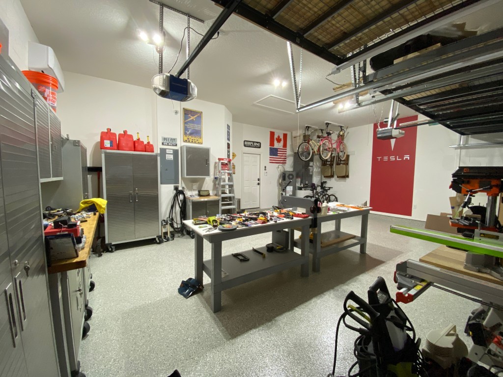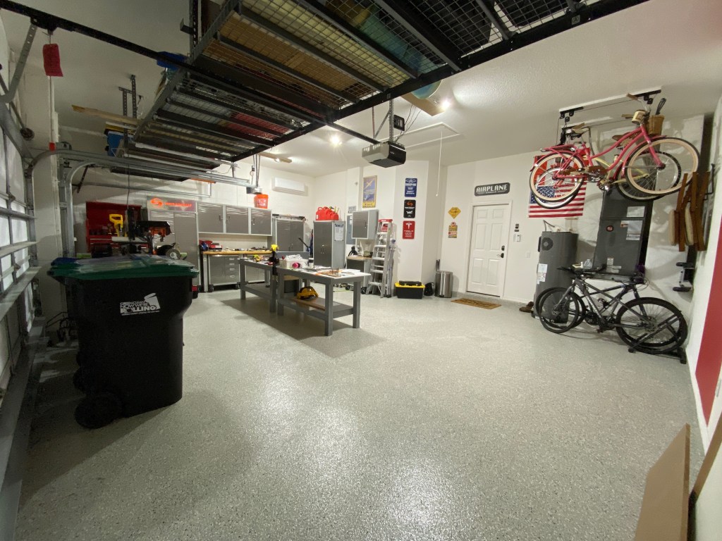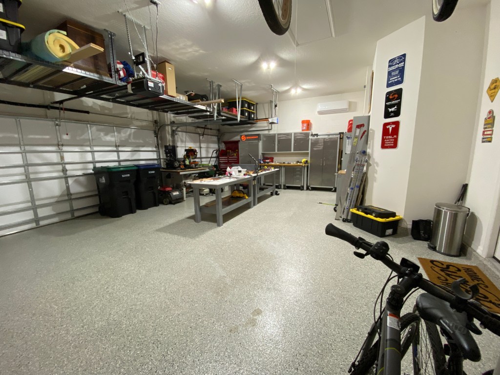 Upon arriving in Florida, we had, for the first time, a 3 car garage! No salt or gravel to cleanup like up north. We installed some overhead racks, epoxy coated the floor, installed some cabinetry, added some lighting, a mini-split air conditioner, a television and absolutely love it!